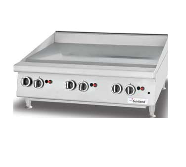 Griddle, countertop, gas, heavy-duty, 47-1/4" W x 23" D cooking surface, 1" thick smooth steel griddle plate, snap action thermostatic controls, piezo pilot igniters, 4" deep front grease trough, stainless steel front, sides and back, 4" adjustable feet, 128,000 BTU (Garland), NSF, CSA Star, CSA Flame