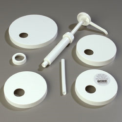 Standard Pump Kit, includes: (1) standard pump with 5" trimmable dip tube, (2) restrictor clips for 1/2 to 1 ounce portions, (5) Lids: 1-1/2", 4-5/16", 4-5/16"SP, 4-11/16", & 6-5/16", plastic, white