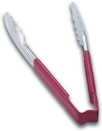 Utility Tong, one-piece, 16" (40.6 cm), plain stainless steel, 20 ga., springless design, ergonomic handle, Red, NSF, USA